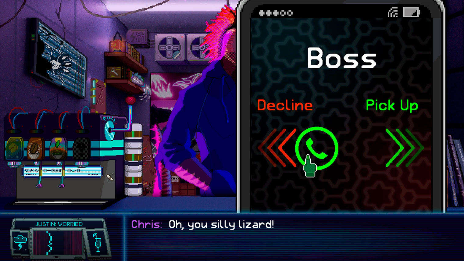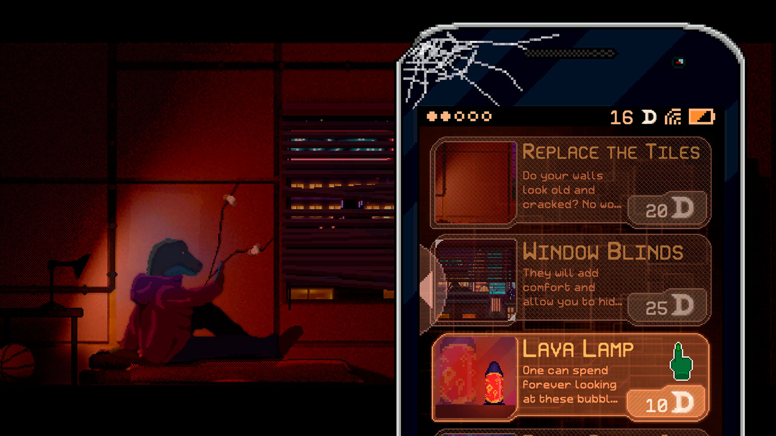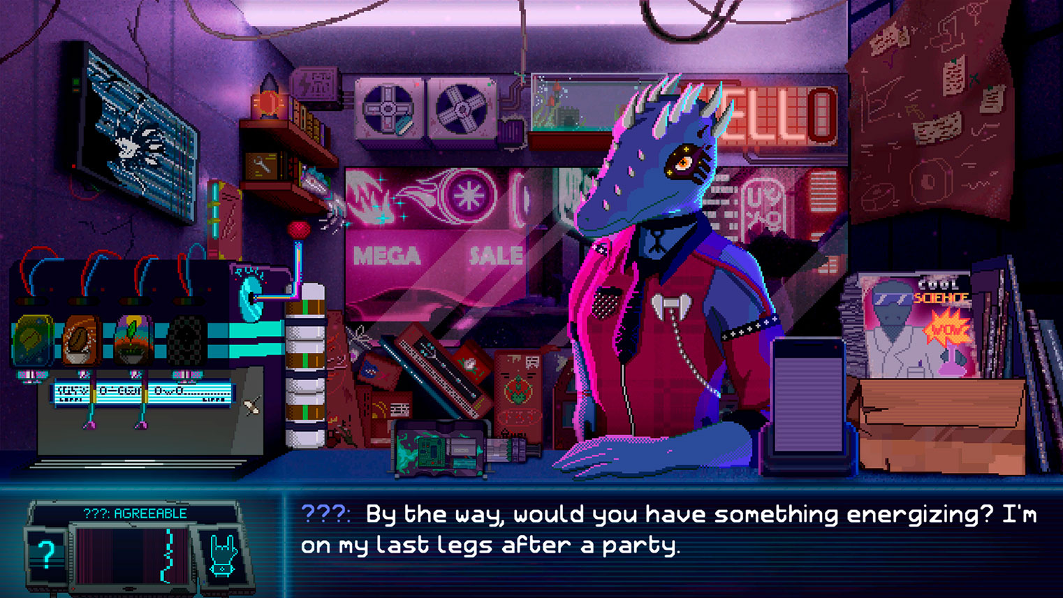 Dynopunk is an ironic adventure set in a cyberpunk world where dinosaurs have taken the place of humans. Run a repair shop, fix gadgets, find a personalized approach to every customer while offering them beverages and having heart-to-heart conversations. At the same time you'll have to sort out your private life and chase your dream.