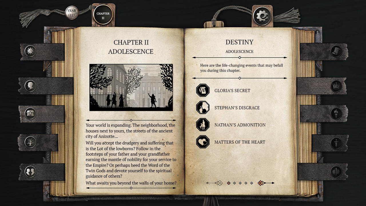 - Divided into chapters, the game keeps track of the player's deeds, the skills they acquired, as well as other overlapping circumstances that shape a unique plotline for each playthrough. Every decision has its consequences and you will be held accountable throughout the entire journey. To protect your family and loved ones, to impose the rule of the Emperor and make a fortune, or to try and change the world as you see fit.